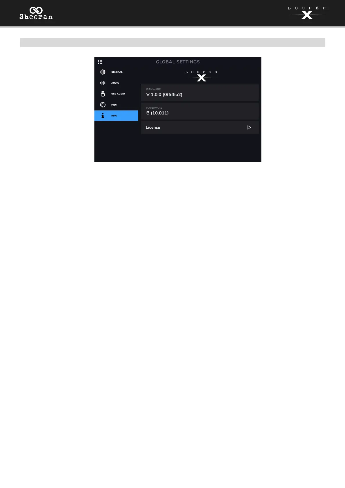 On this tab, you can view the currently installed firmware version. You can also access Sheeran Looper X’s