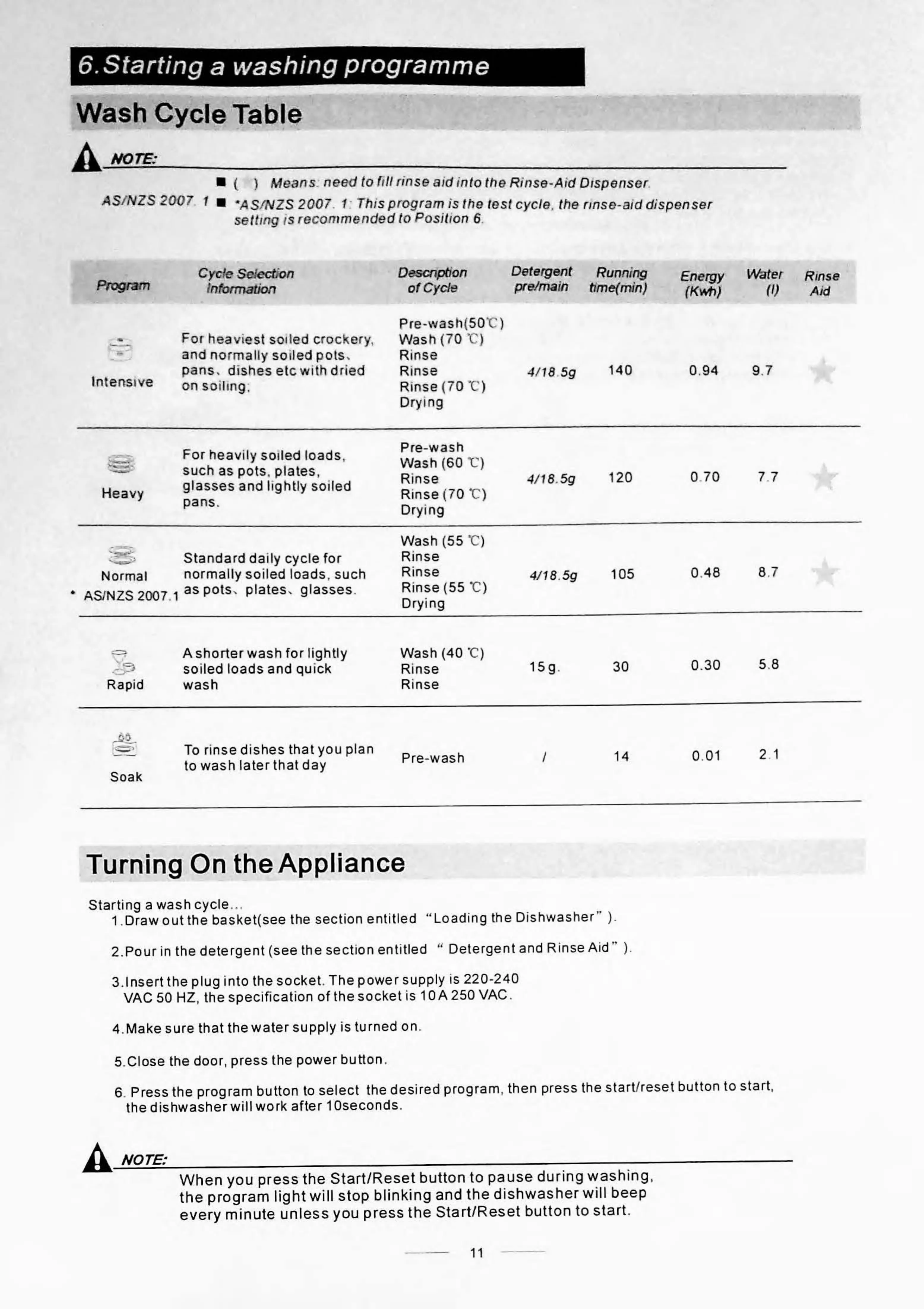Sheffield PLA0963S - Starting a Washing Programme; Wash Cycle Table; Turning On the Appliance