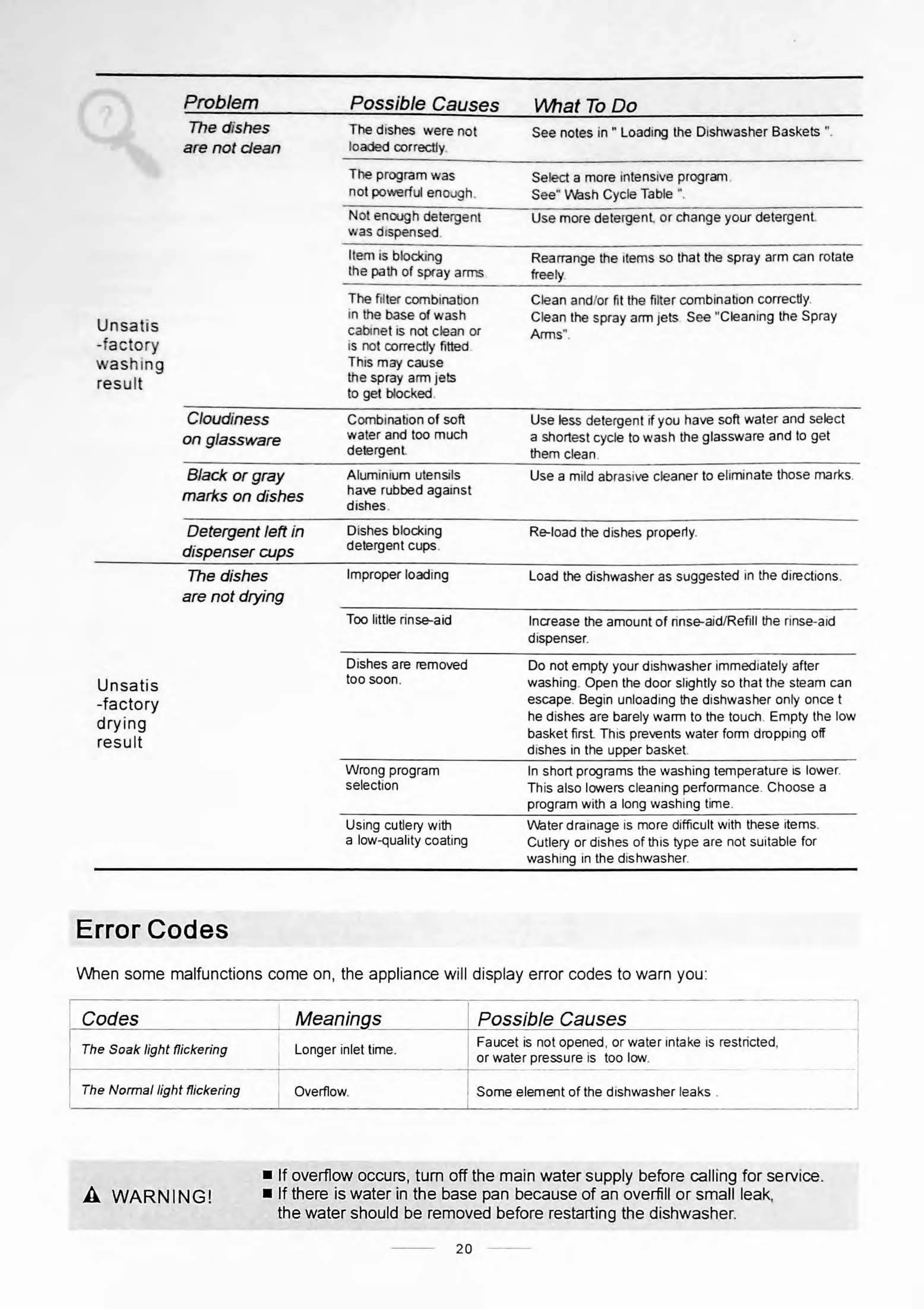 Sheffield PLA0963S - Unsatisfactory Washing Results; Washing Performance Issues; Drying Performance Issues; Error Codes