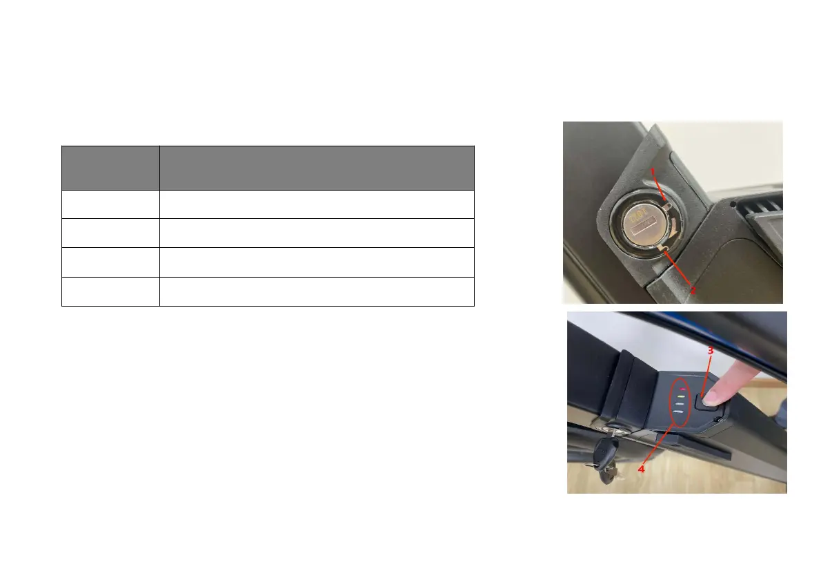 the small open circle icon. In key position 1, the battery is in the "lock" position, with the battery locked to the frame, and the key removed so the bike is ready to