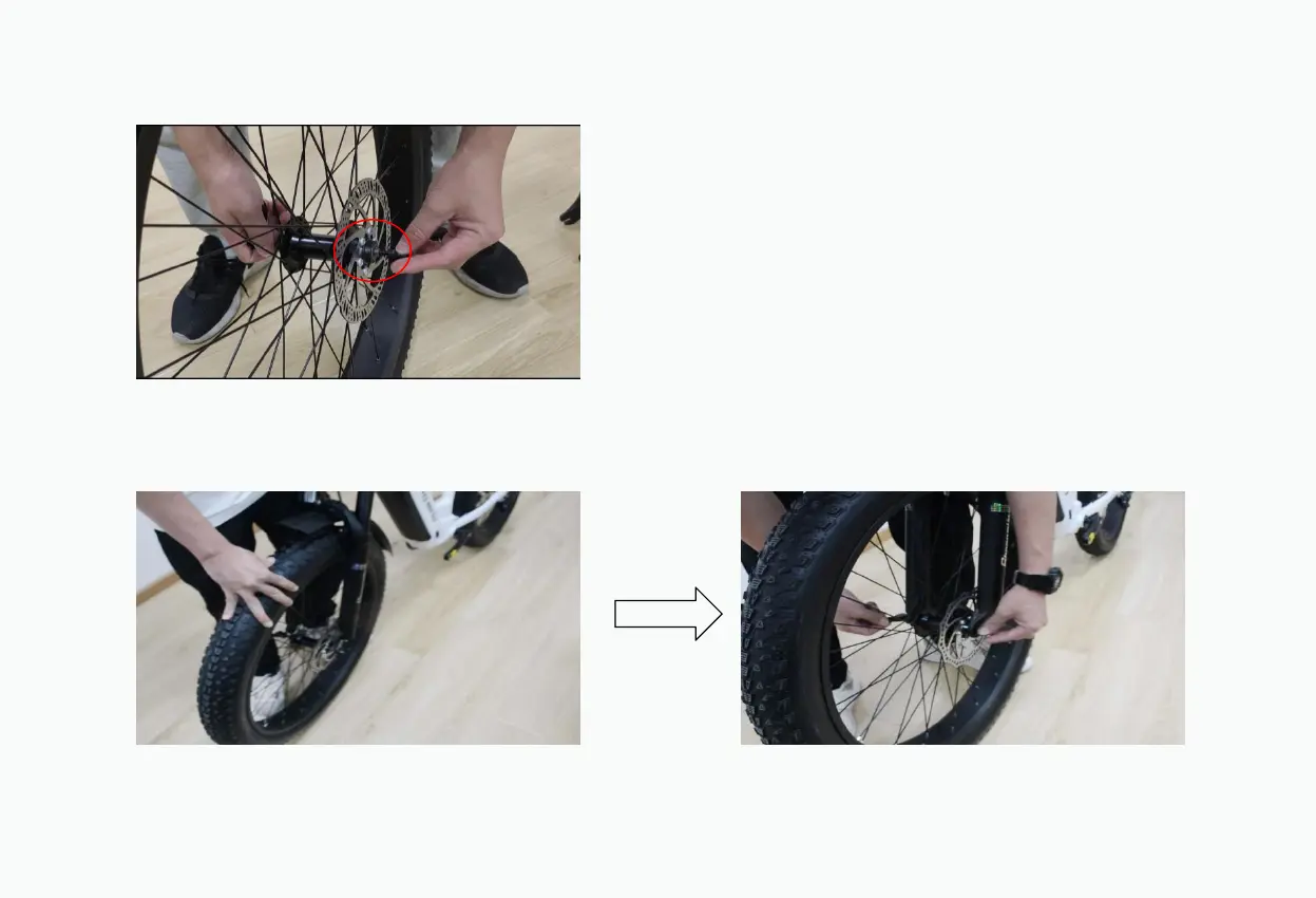 Step 4 : Align the fork dropouts with the axle of the wheel hub, making sure the dropouts are securely positioned on the axle. Also ensure the brake rotor is