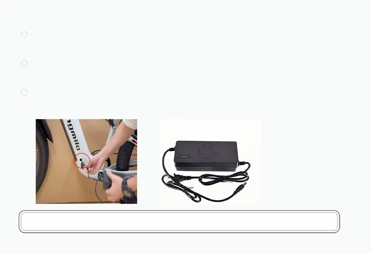 Start by plugging the charger into the battery charging port. With the battery inside the bike, place the charger on a flat, safe place