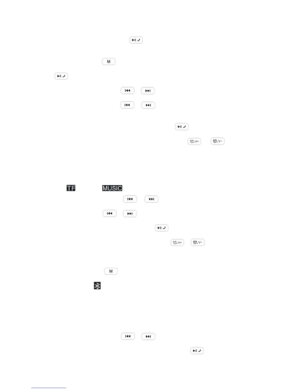 4. When TF card state. Short press or long press “V+ / V-” / to adjust volume.