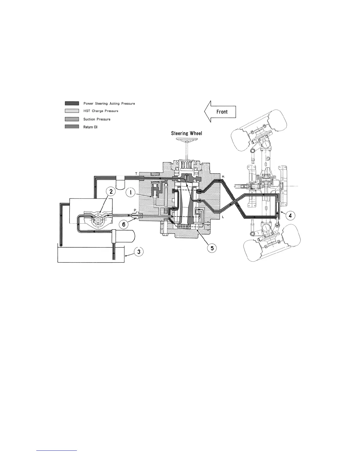rod side of the power steering cylinder and causes the front wheels to turn right. The oil contained in the piston side of the