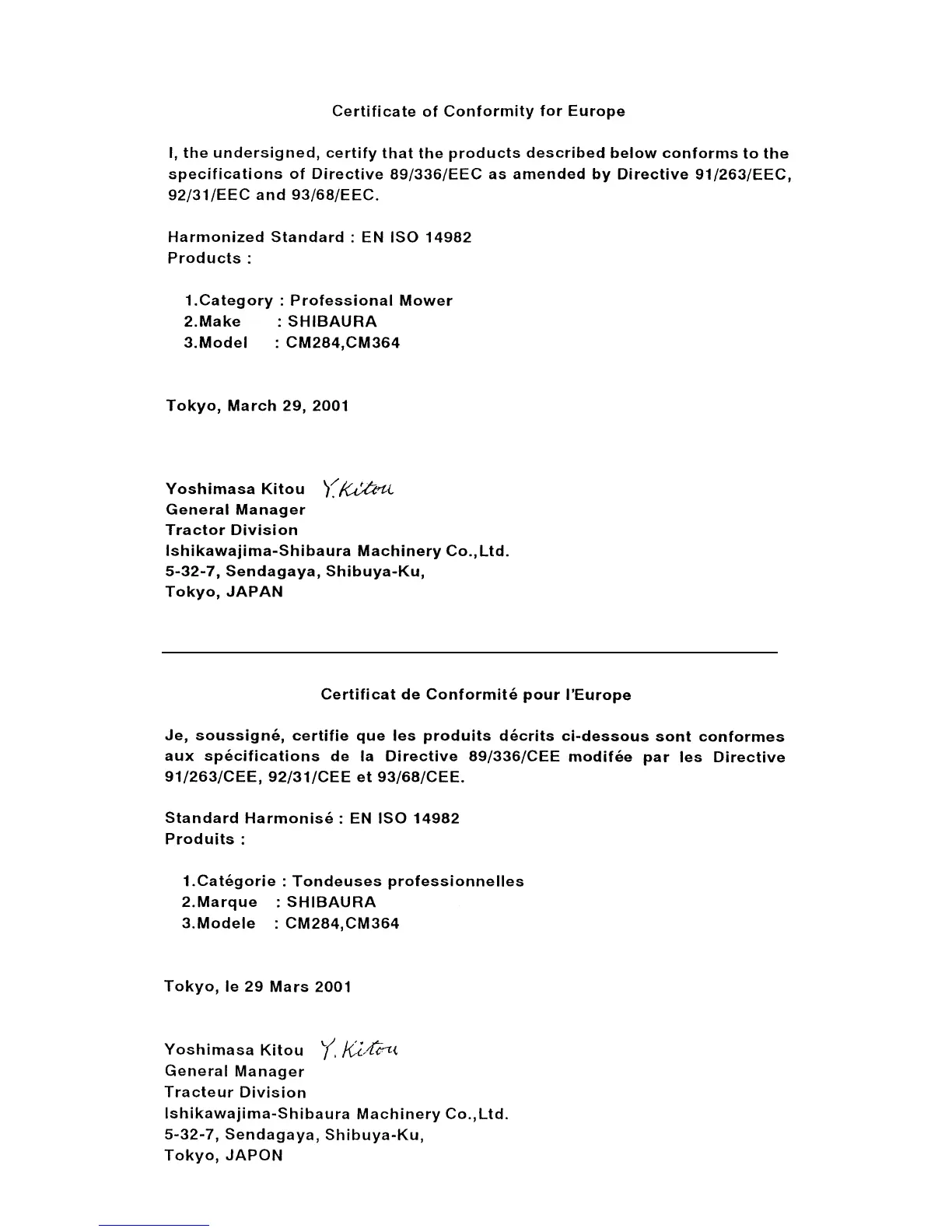 Shibaura CM374 - CERTIFICATE OF CONFORMITY; EUROPEAN CONFORMITY DECLARATION