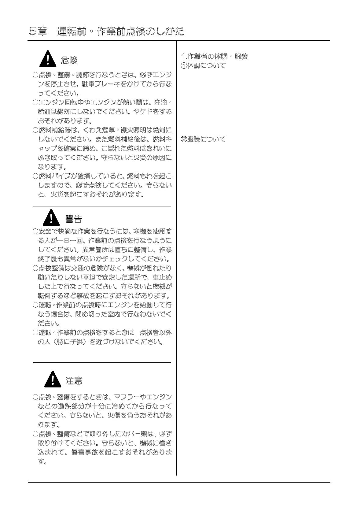 Shibaura SG280B - 5章 運転前・作業前点検のしかた; 作業者の体調・服装について