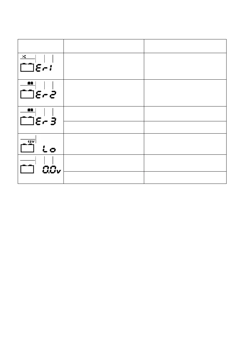 In cause of faults, the battery tester will display the following indications: