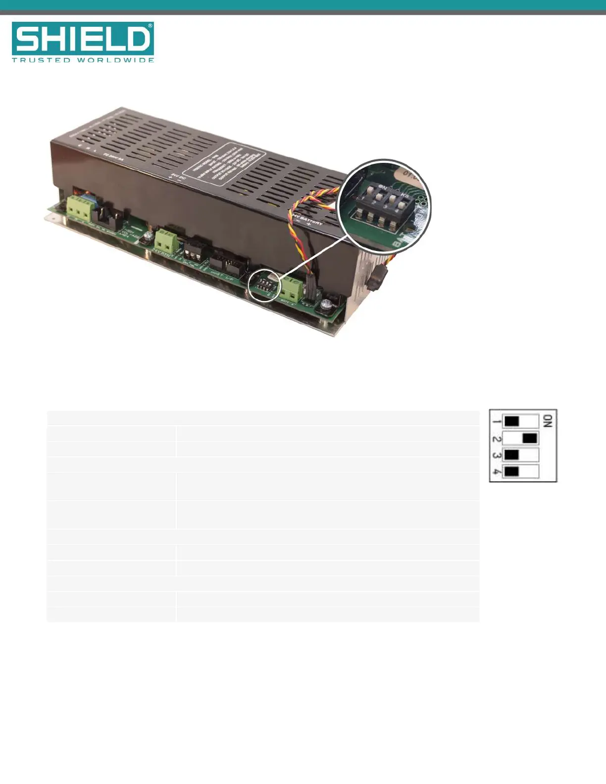 The tables below describes DIP switch settings 1 through 4 of the 10.25 Amp Power Supply.