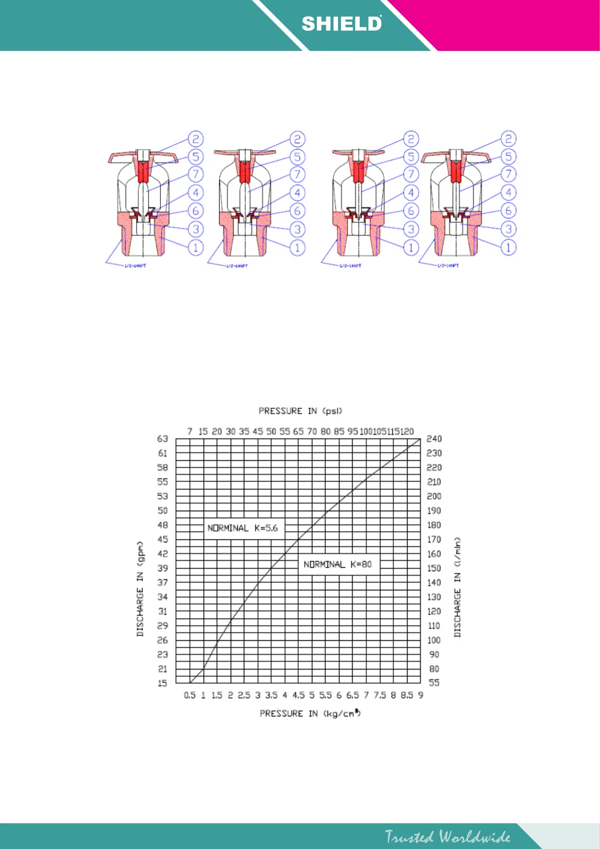 Shield SD1010 - SHIELD Upright, Pendent & Recessed Pendent Sprinkler Data; Part List (SD1015, SD1010, SD1030, SD1032); Discharge Curve