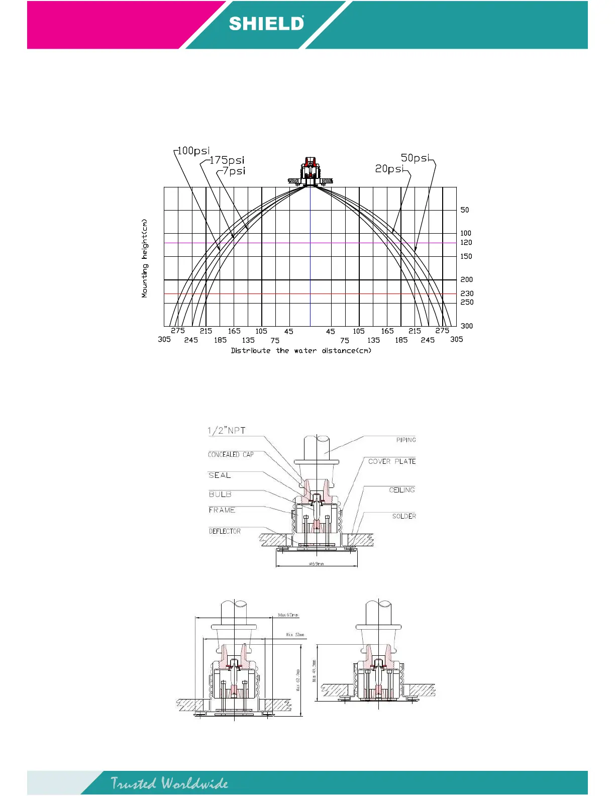 Shield SD1010 - SHIELD Concealed Sprinkler Distribution Patterns; K5.6 Pendent Sprinkler Trajectory; SHIELD Concealed Sprinkler Dimensions