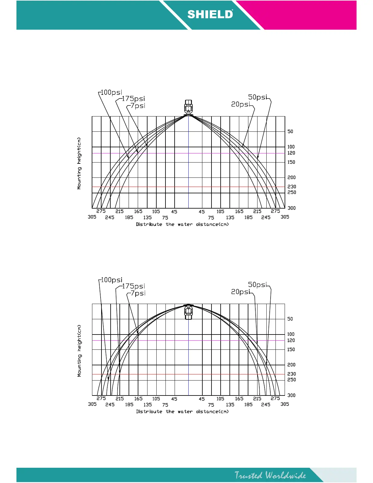 Shield SD1010 - SHIELD Upright, Pendent & Recessed Pendent Sprinkler Distribution Patterns; K5.6 Pendent Sprinkler Trajectory; K5.6 Upright Sprinkler Trajectory