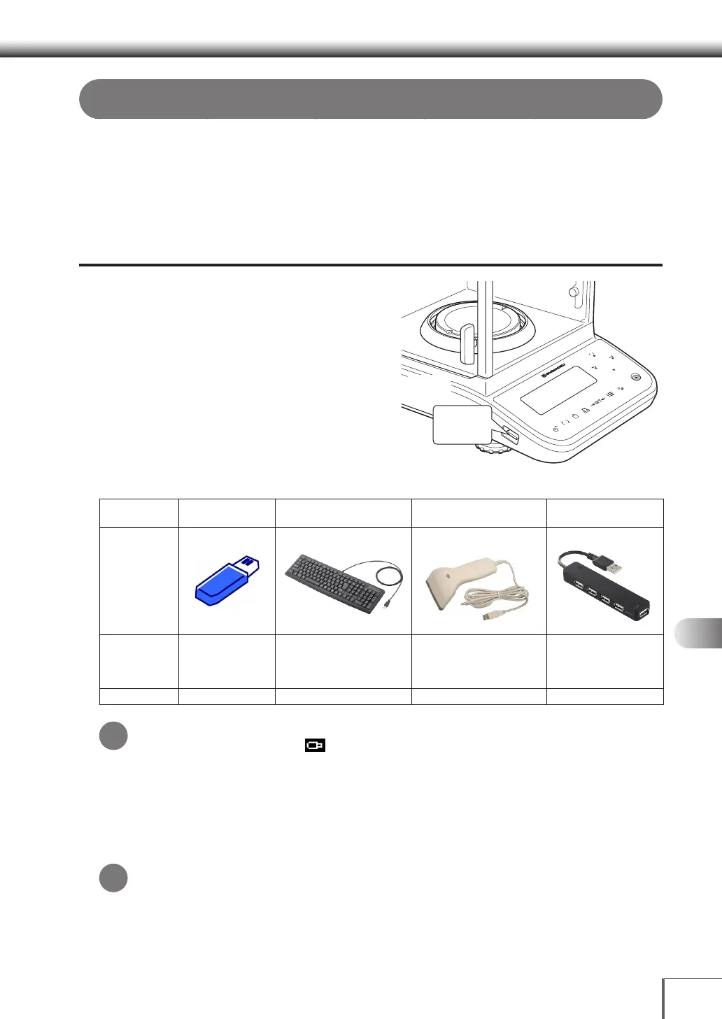 connecting a USB memory, and to transmit commands to the balance by connecting a USB keyboard