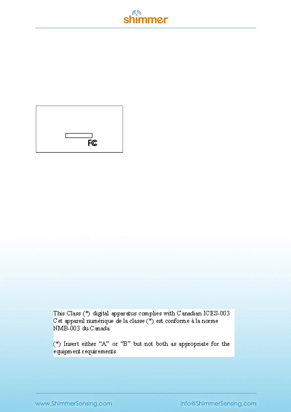 The FCC ID marking label is attached to the back of the Shimmer and is to remain attached at all times to