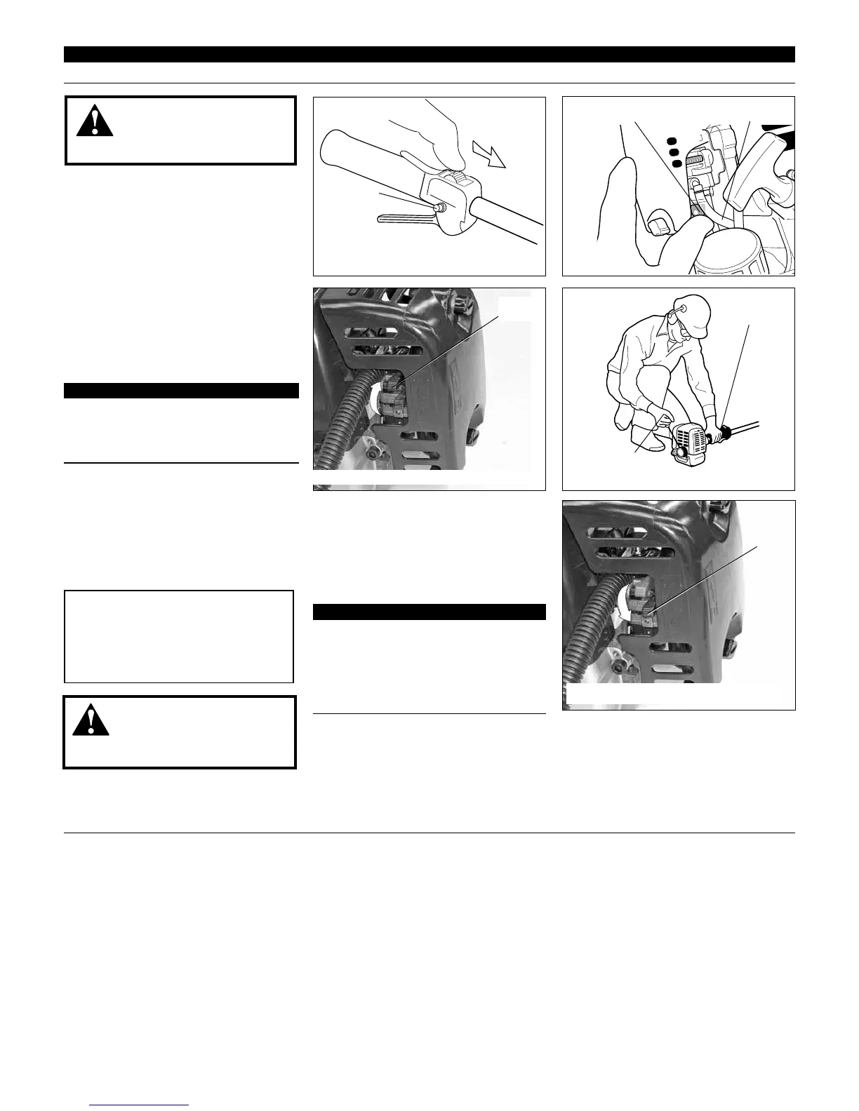 Engine ignition is controlled by a two position switch mounted on the throttle housing labeled, “I” for ON or START and “O” for OFF or STOP.