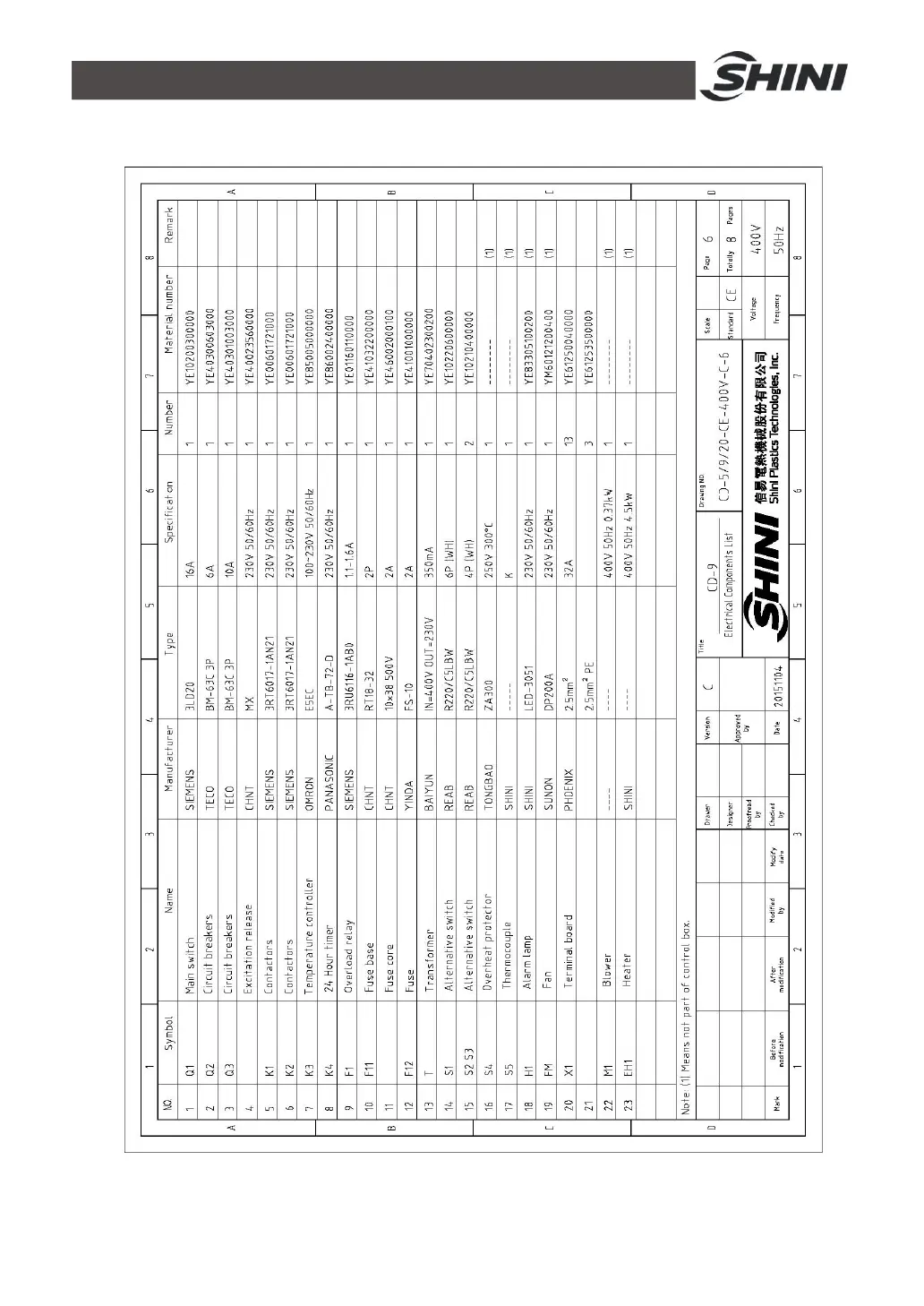 Shini CD SERIES - Table 2-4:Electrical Components List (CD-9) (400 V)