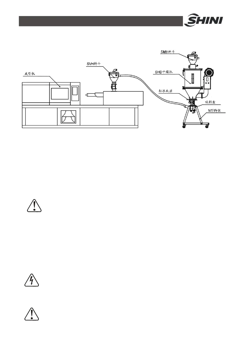 脚架安装型即将干燥机安装于脚架上,然后通过一个电眼料斗把料送至成型机进料