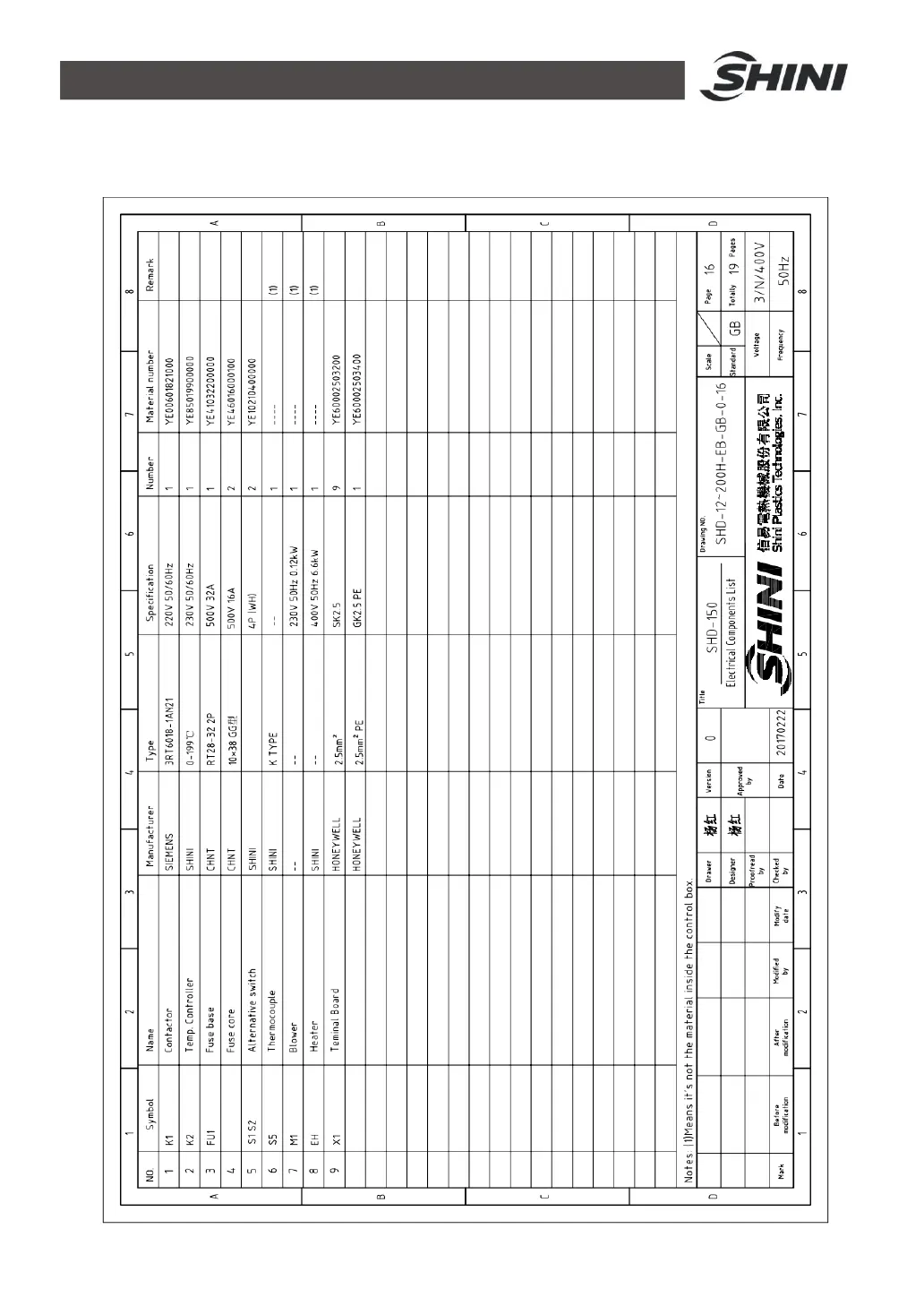 Table 2-14: Electrical Components List (SHD-150-EB)