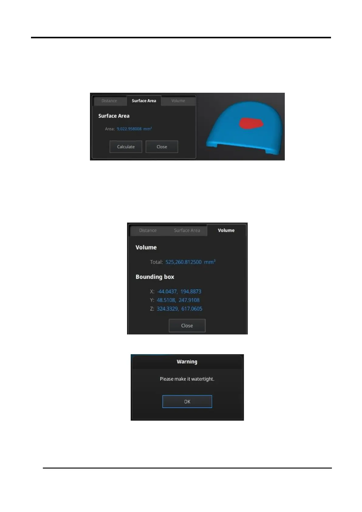 It returns the volume in mm^3 and the coordinates of the smallest box, parallel to the global