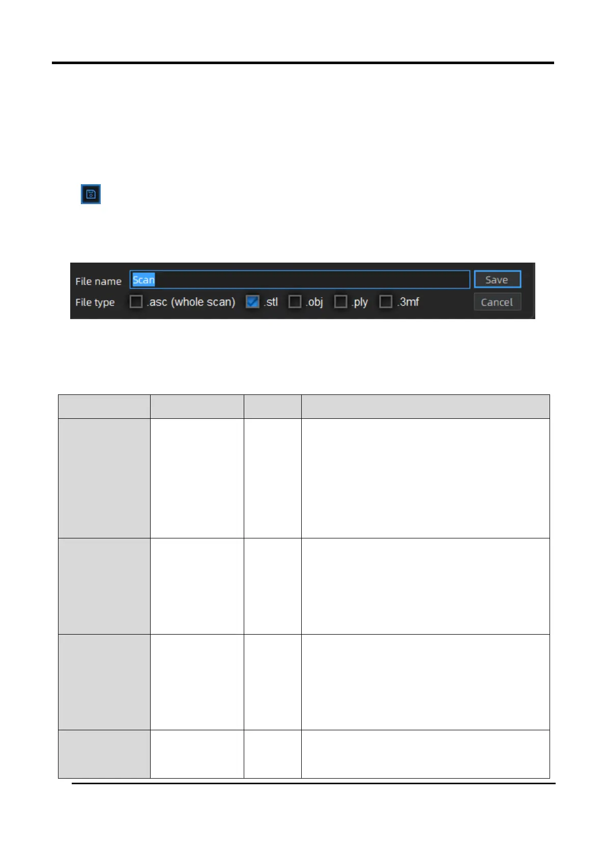 saving path is the project folder, the file name is “Scan data”, and the format is .stl. The format of