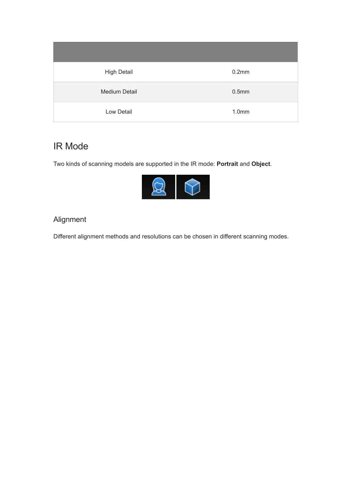 Two kinds of scanning models are supported in the IR mode: Portrait and Object.