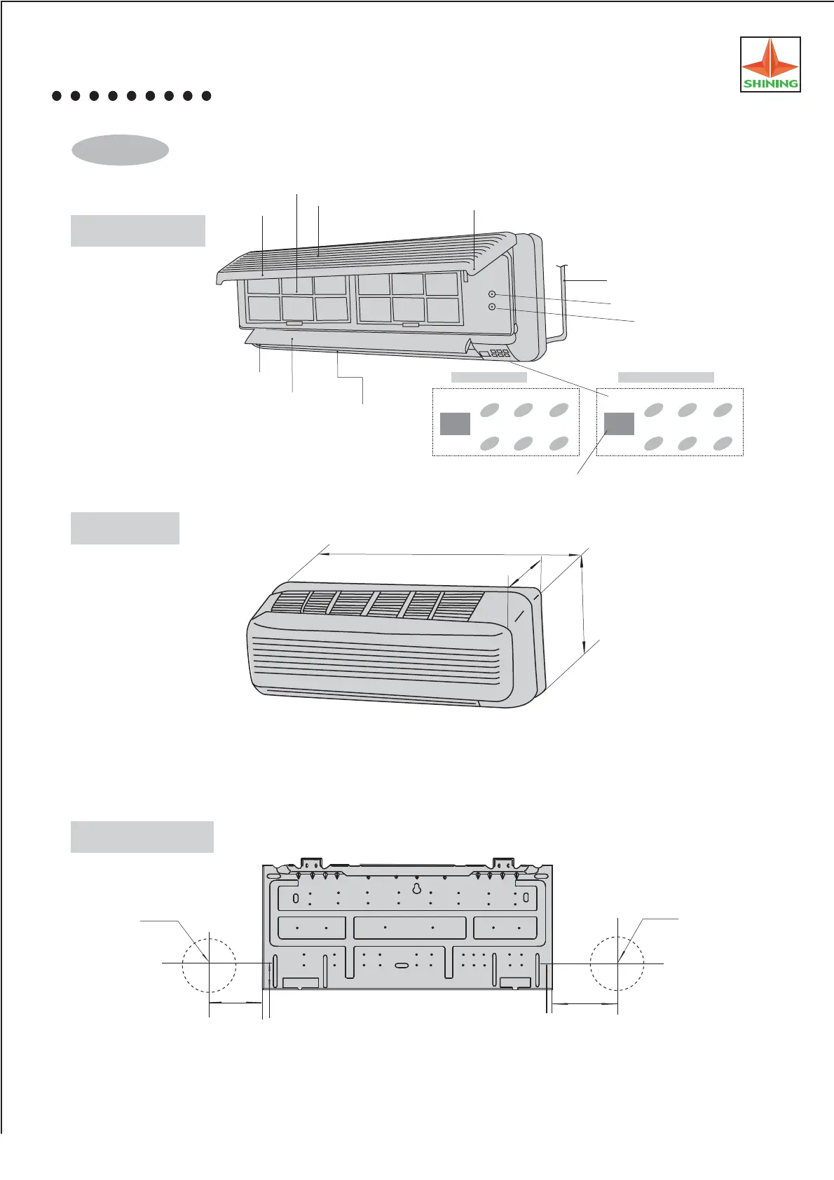 Shining KF-26GW - Name of Parts; Installation Size; Dimensions; Indoor Unit