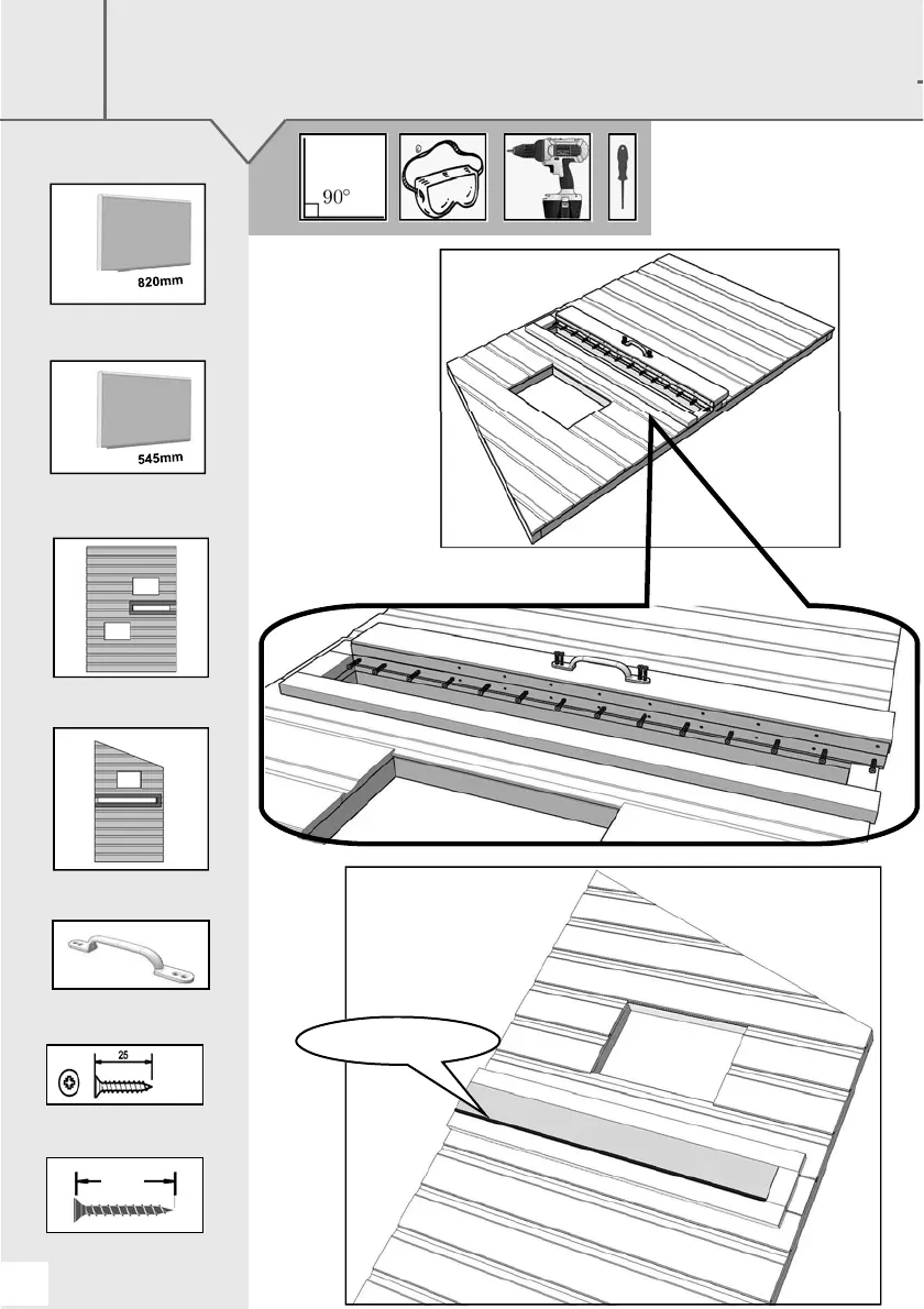 the edge of the surround below then fix with 14 screws for the long hinge and 10 for the short one.
