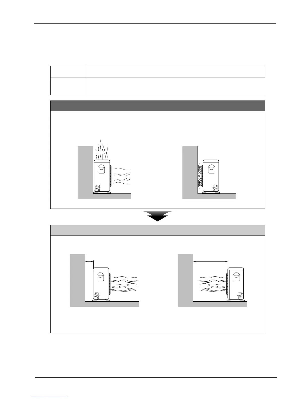 1. The space for air intake is too narrow. 2. The space for air discharge is too narrow.