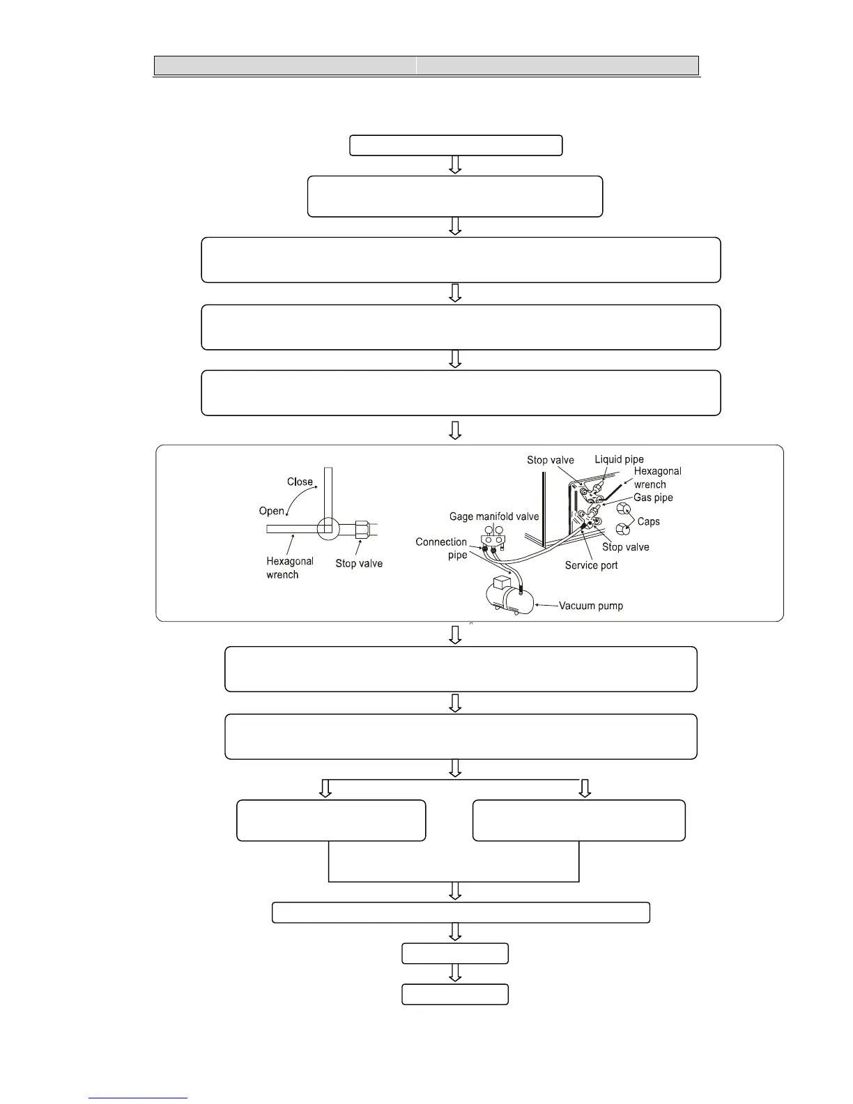 Remove service port cap of the stop valve A and connect gage manifold valve and vacuu