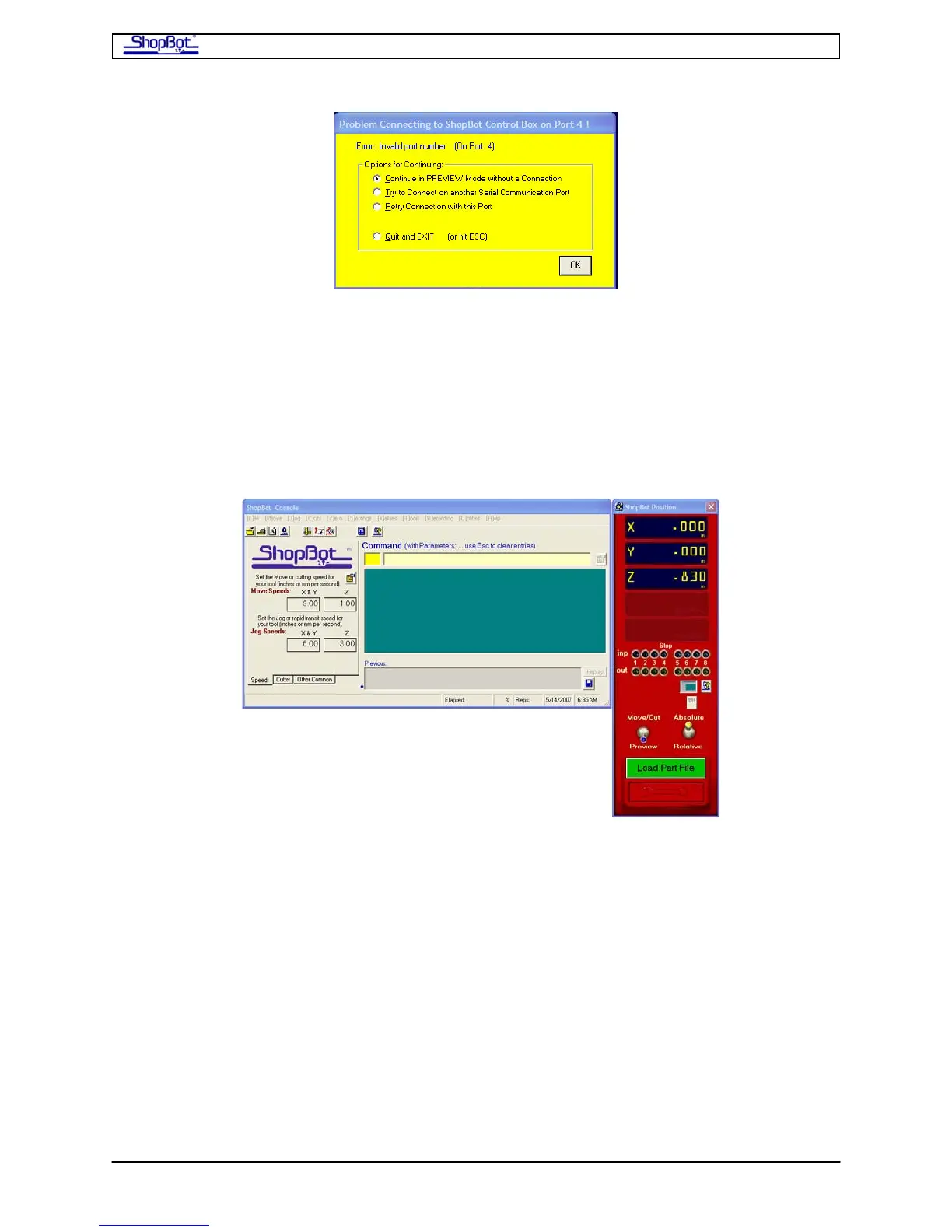 Once you are connected, the ShopBot Control Software will bring up two Windows. The red