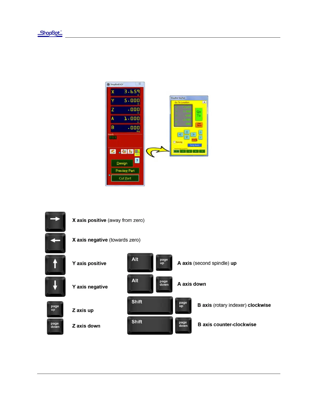 Use the buons on the keyboard (see below) to move the spindle/router along each axis.