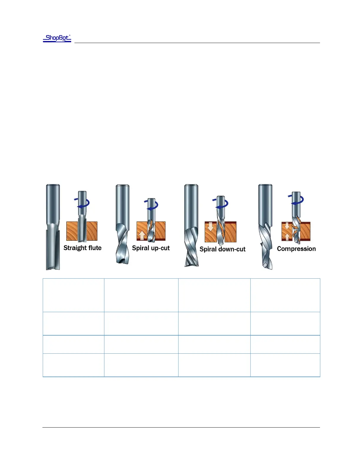 Flute type: There are four basic ute types: Straight, spiral up-cut, spiral down-cut, and compression.