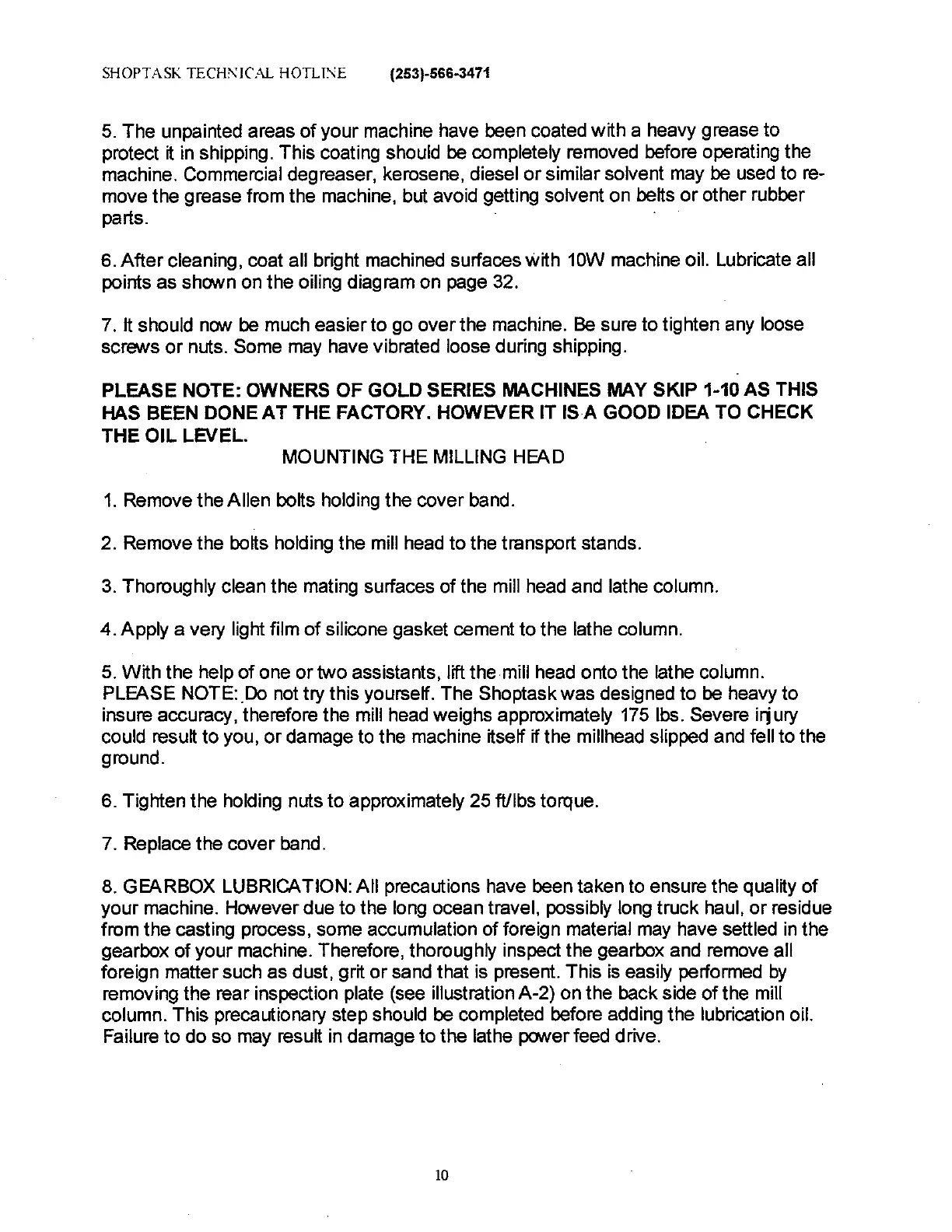 SHOPTASK 17-20 XMTC - Milling Head Installation; Mounting the Milling Head; Gearbox Maintenance; Gearbox Lubrication and Inspection