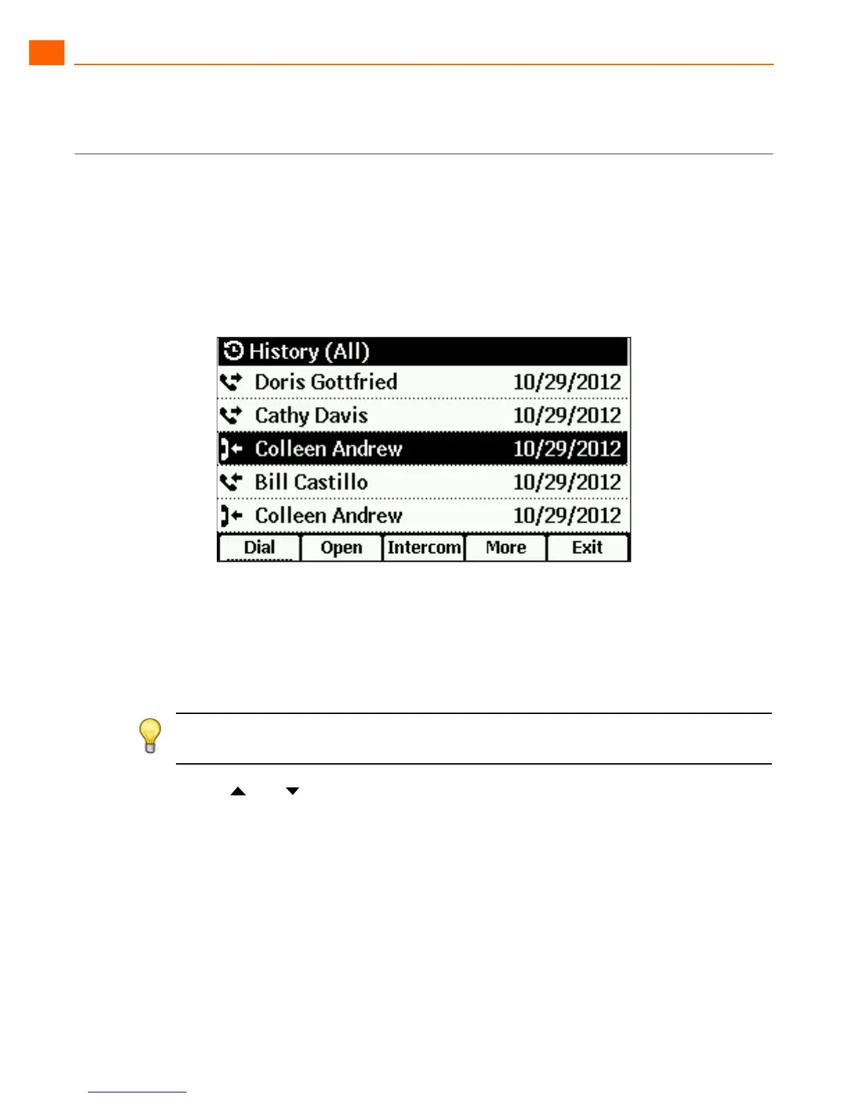 2. Use the and navigation keys to scroll through and review your call history. (To scroll