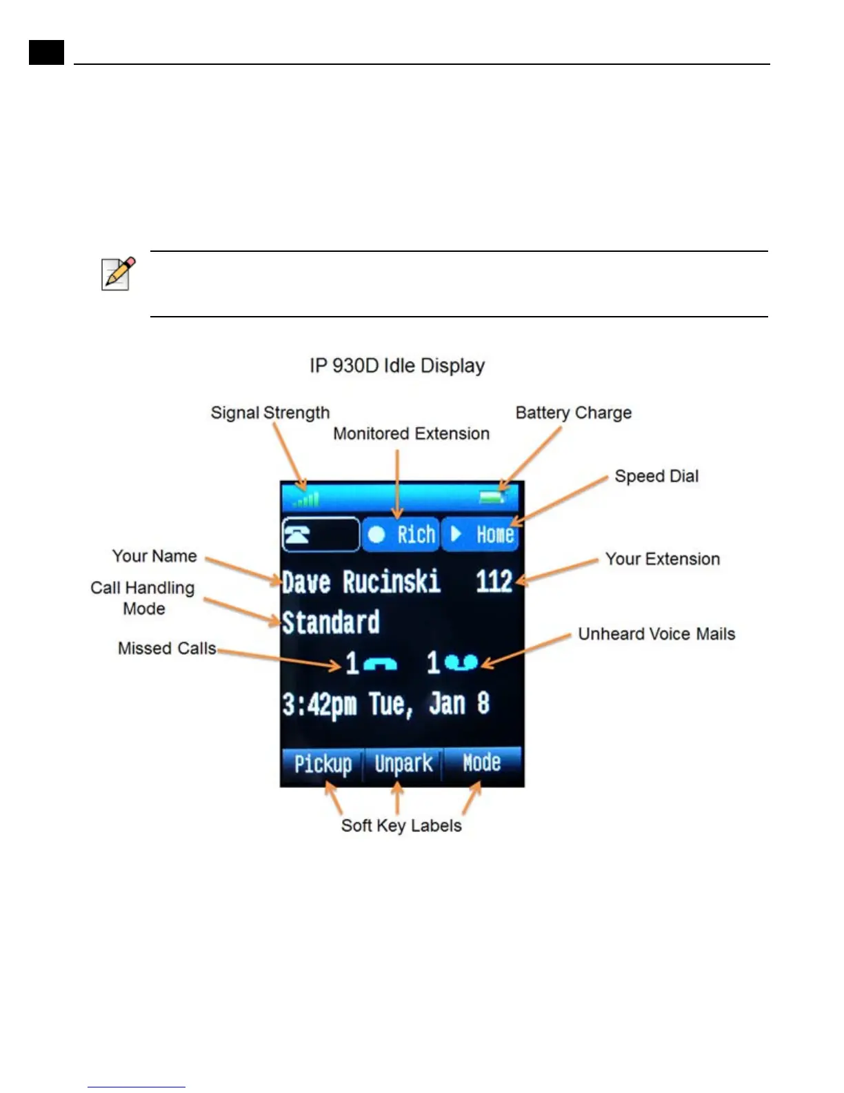 The display screen on your phone shows your name and extension, call handling mode, call