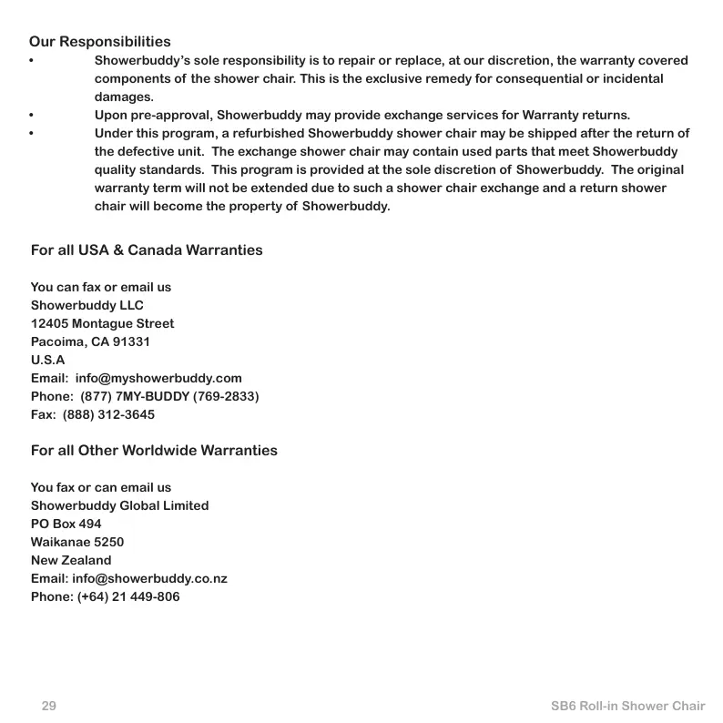 • Showerbuddy’s sole responsibility is to repair or replace, at our discretion, the warranty covered