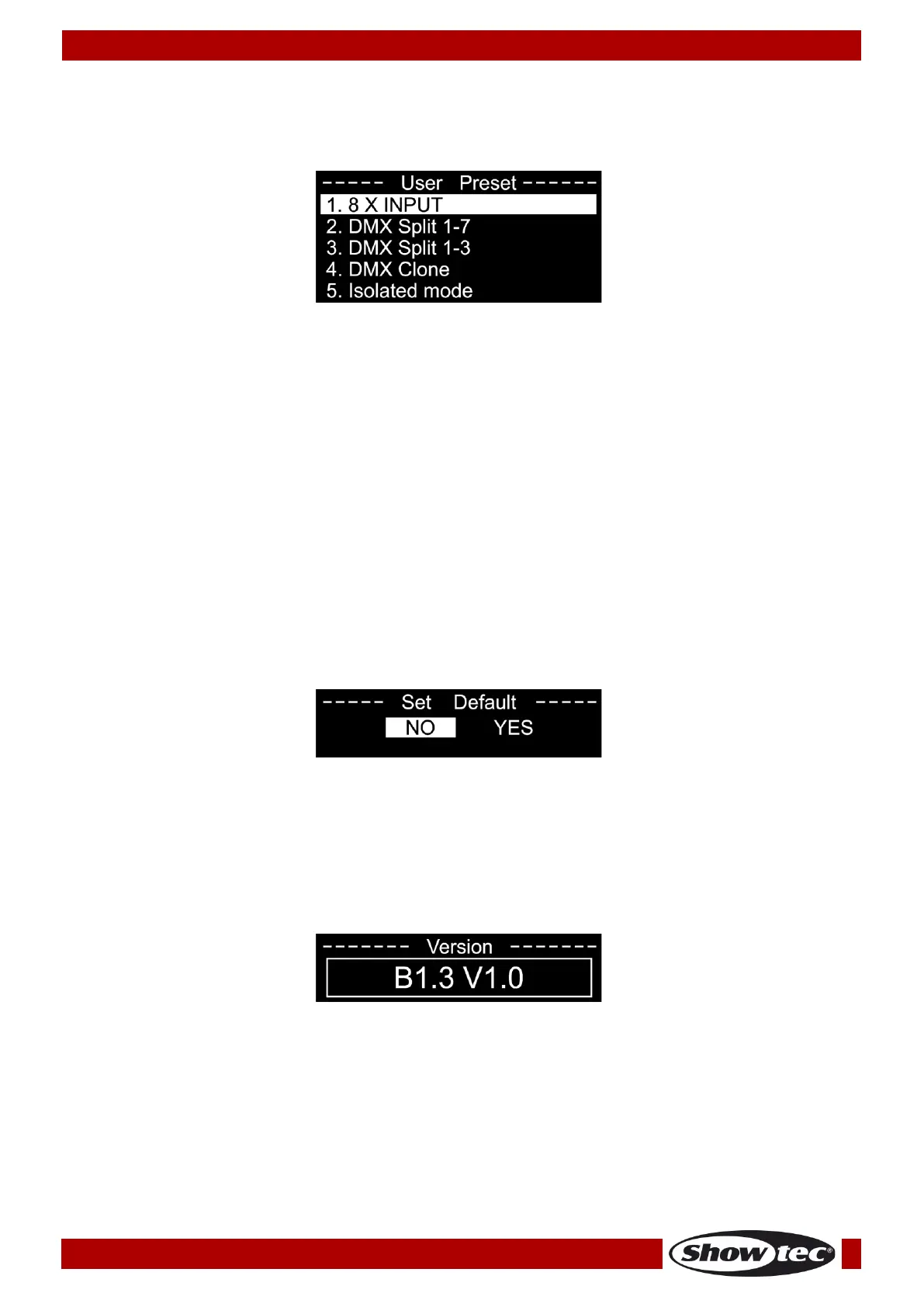 ● DMX SPLIT 1–3: DMX splitter with 2 x DMX inputs and 3 isolated DMX outputs (DMX port 1 is an