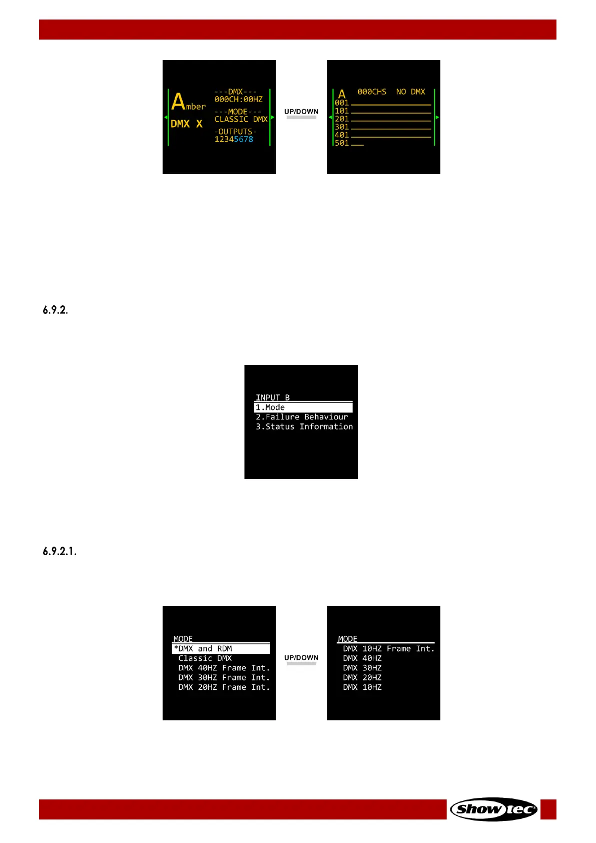 The first screen provides information about the presence of DMX signal, the DMX channel and frame rate,