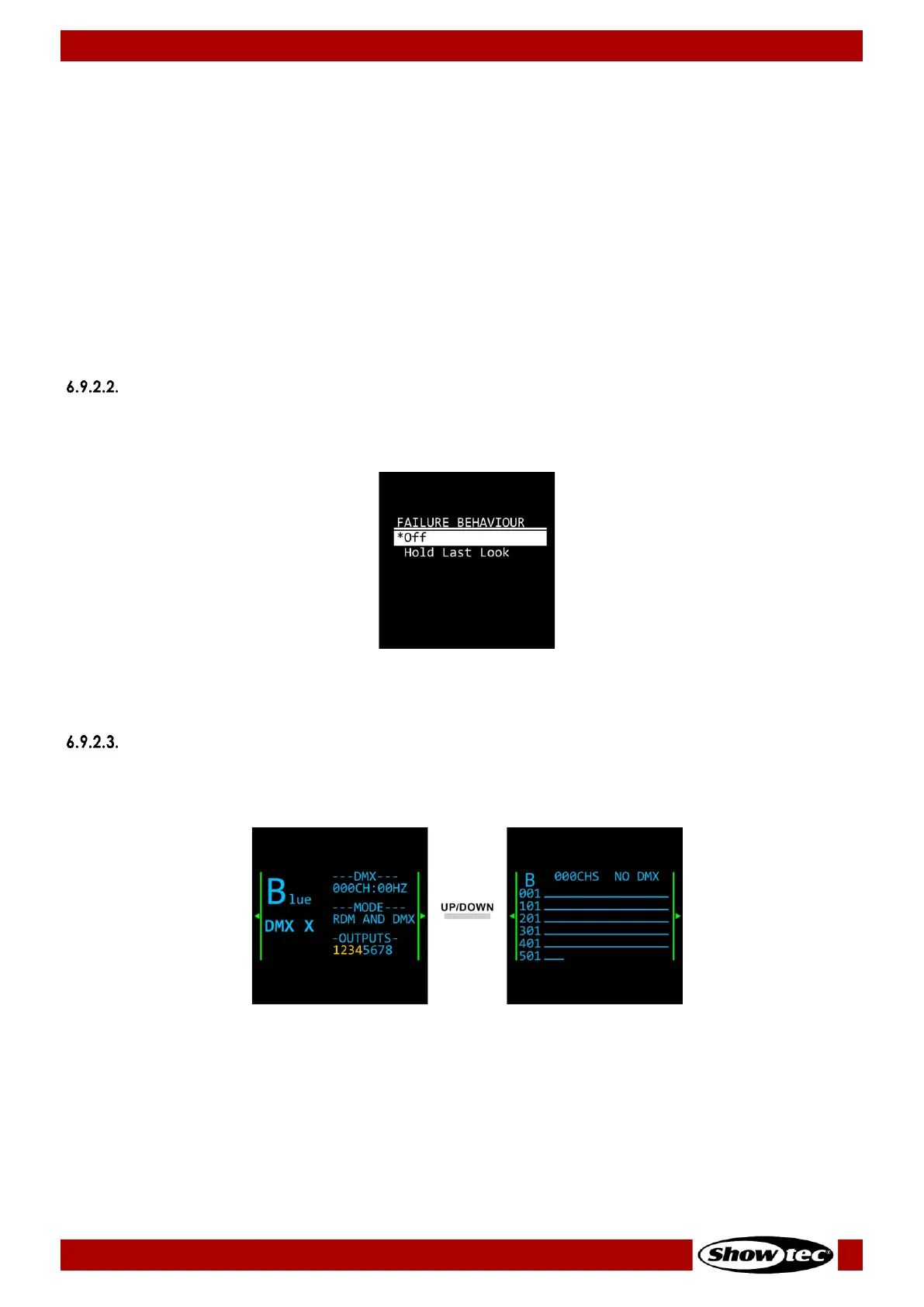 In this submenu you can set the behavior of the device in case of a DMX failure.