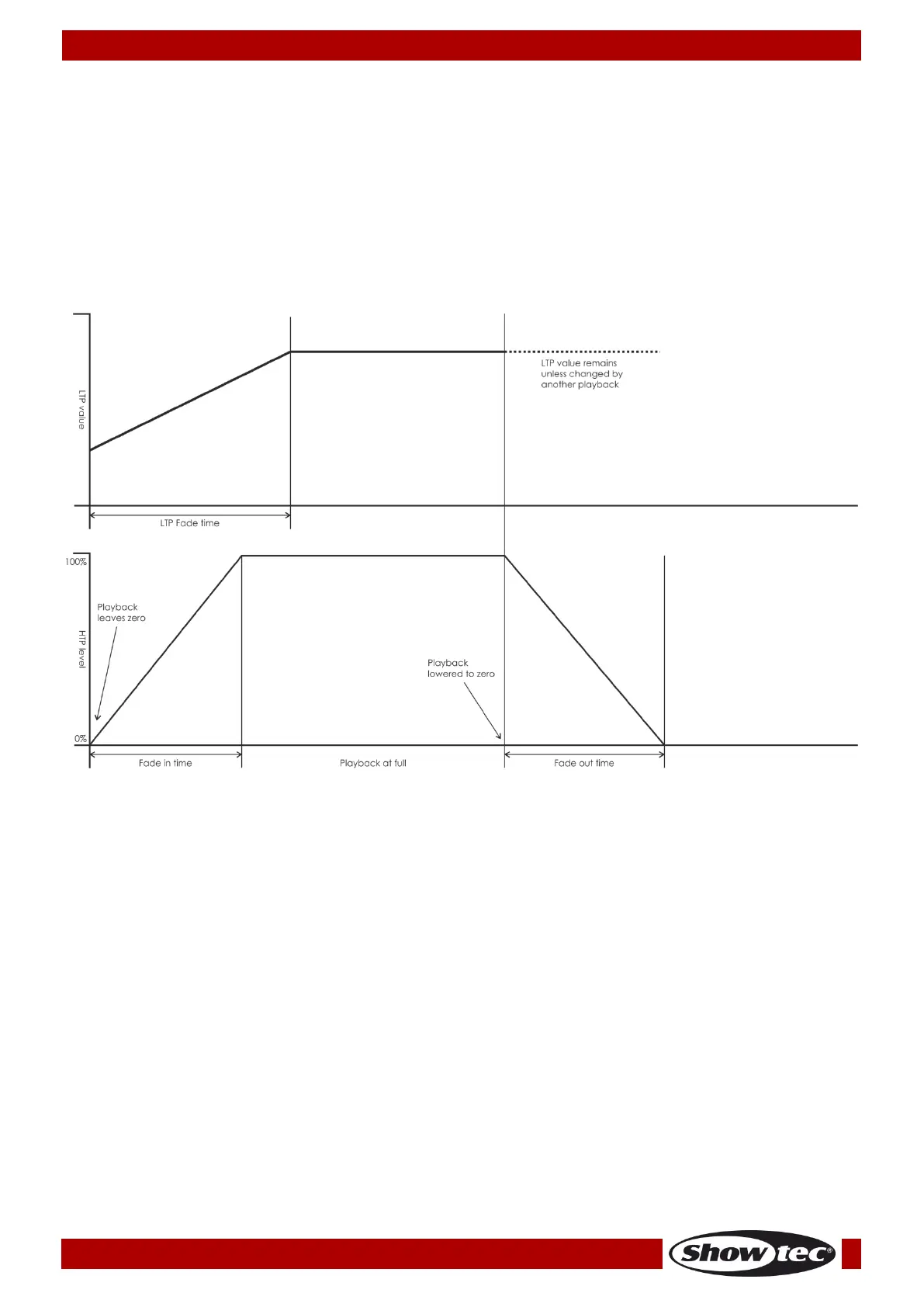 Mode 2 – HTP channels fade as set by the HTP times, or with the fader if times are set to 0. LTP