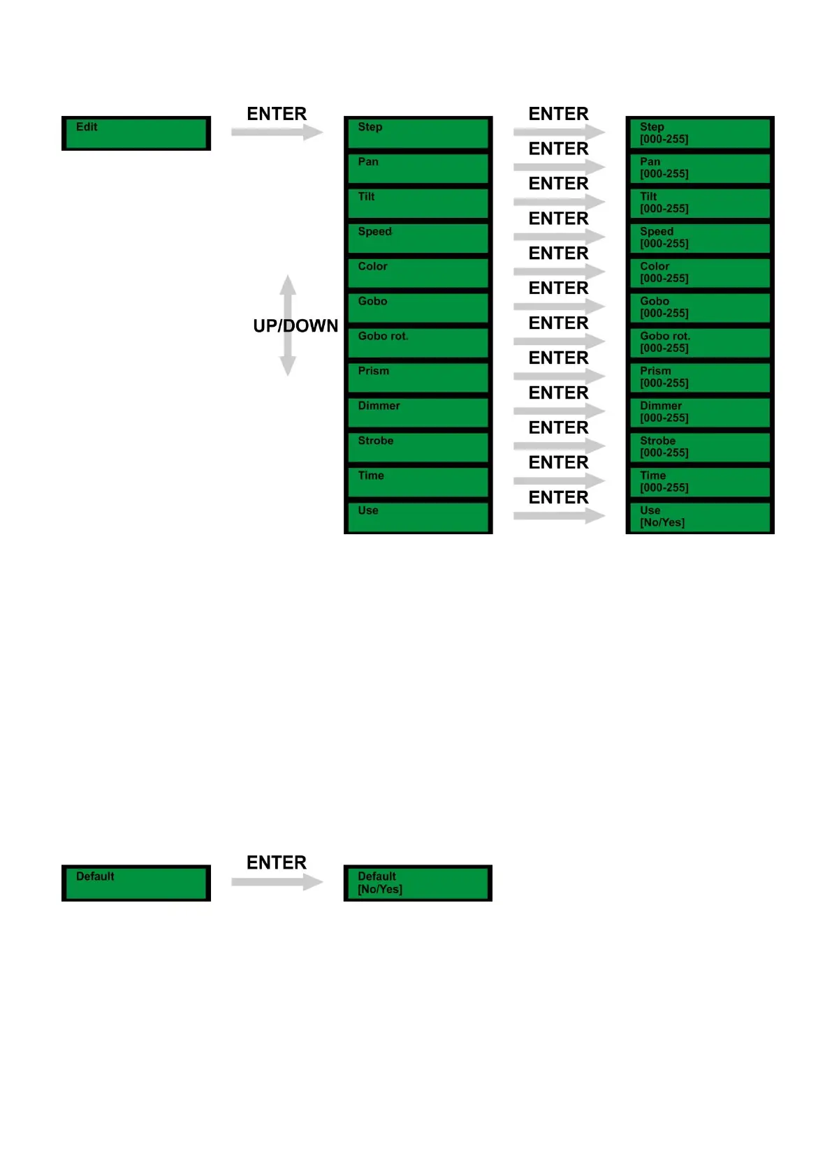 2) Press Enter and use the Up/Down buttons to scroll through the options: Step, Pan, Tilt, Speed, Color,