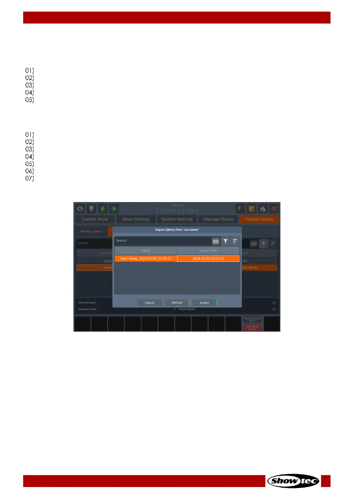 Make sure the fixture library file is in the showtec/library folder on your USB Key.