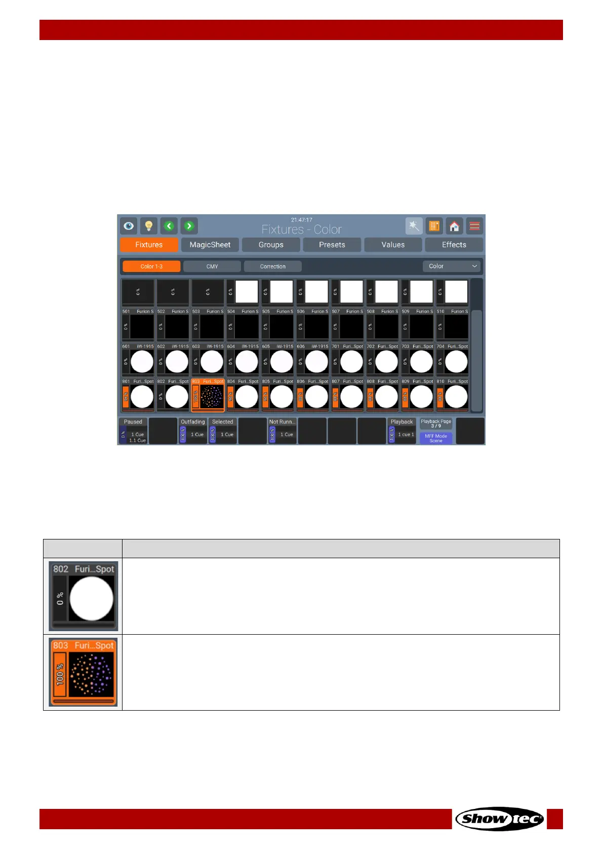 and a Gobo. Pan / Tilt is centered. The Red Bar at the bottom indicates that this fixture