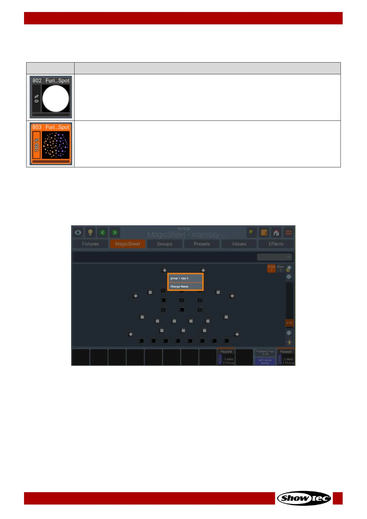 and a Gobo. Pan / Tilt is centered. The Red Bar at the bottom indicates that this fixture