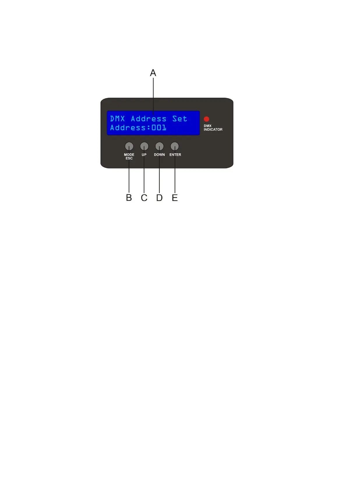 The control panel on the front side of the base allows you to assign the DMX fixture address, which is the