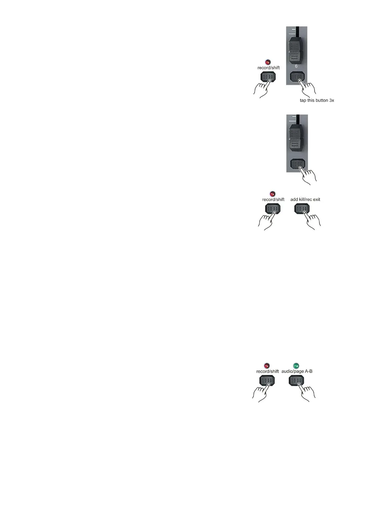 4. Push and hold the record/shift (14) button while you tap the add kill/rec (12) button to exit fader
