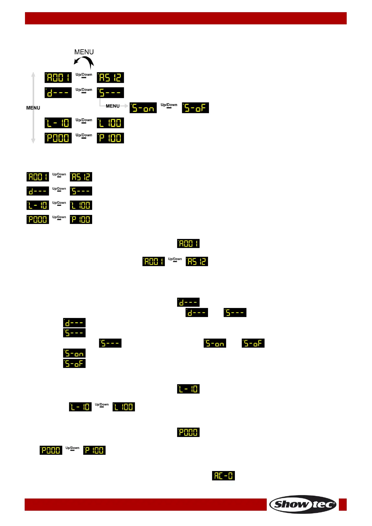 04) Press and hold down the UP/DOWN buttons for fast DMX address selection.