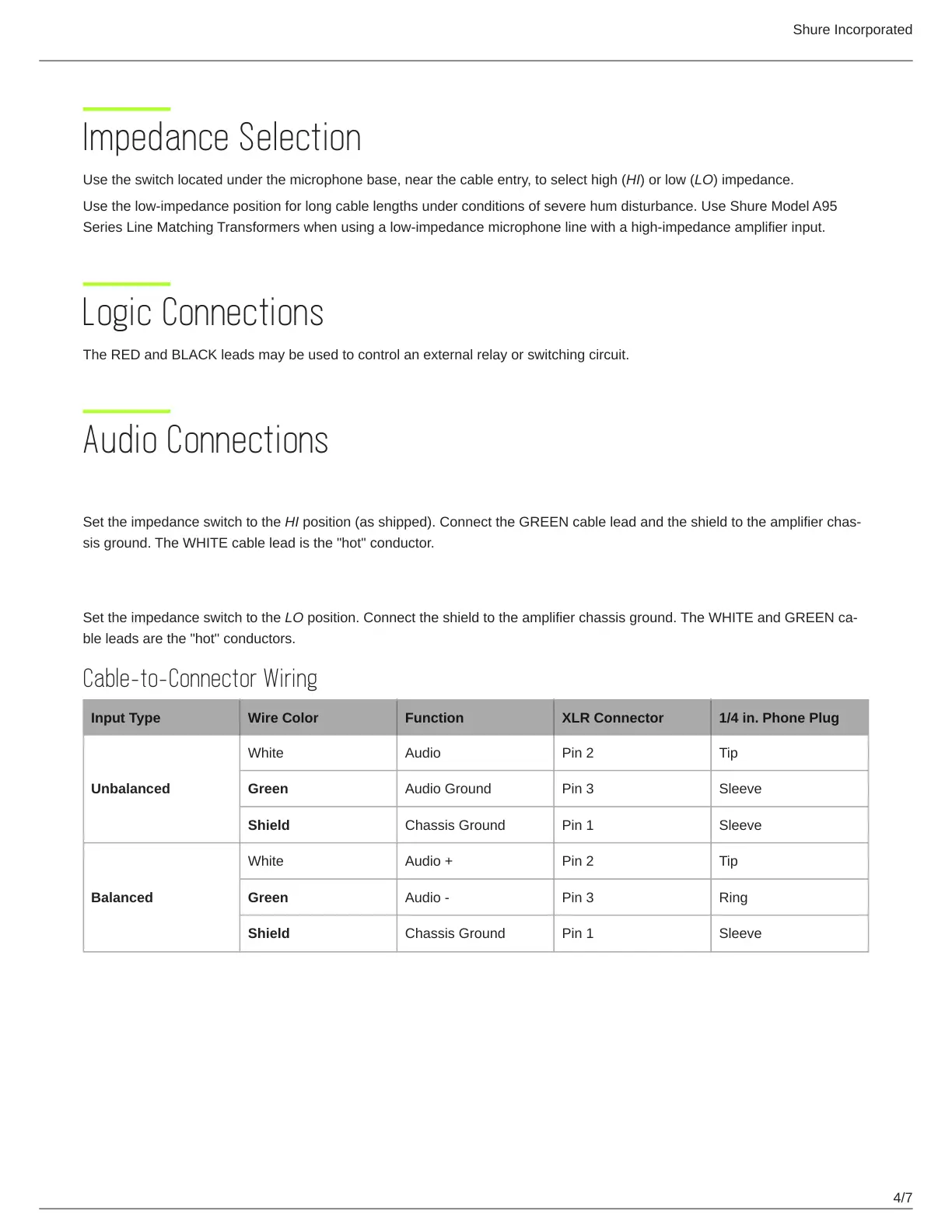 Set the impedance switch to the LO position. Connect the shield to the amplifier chassis ground. The WHITE and GREEN ca