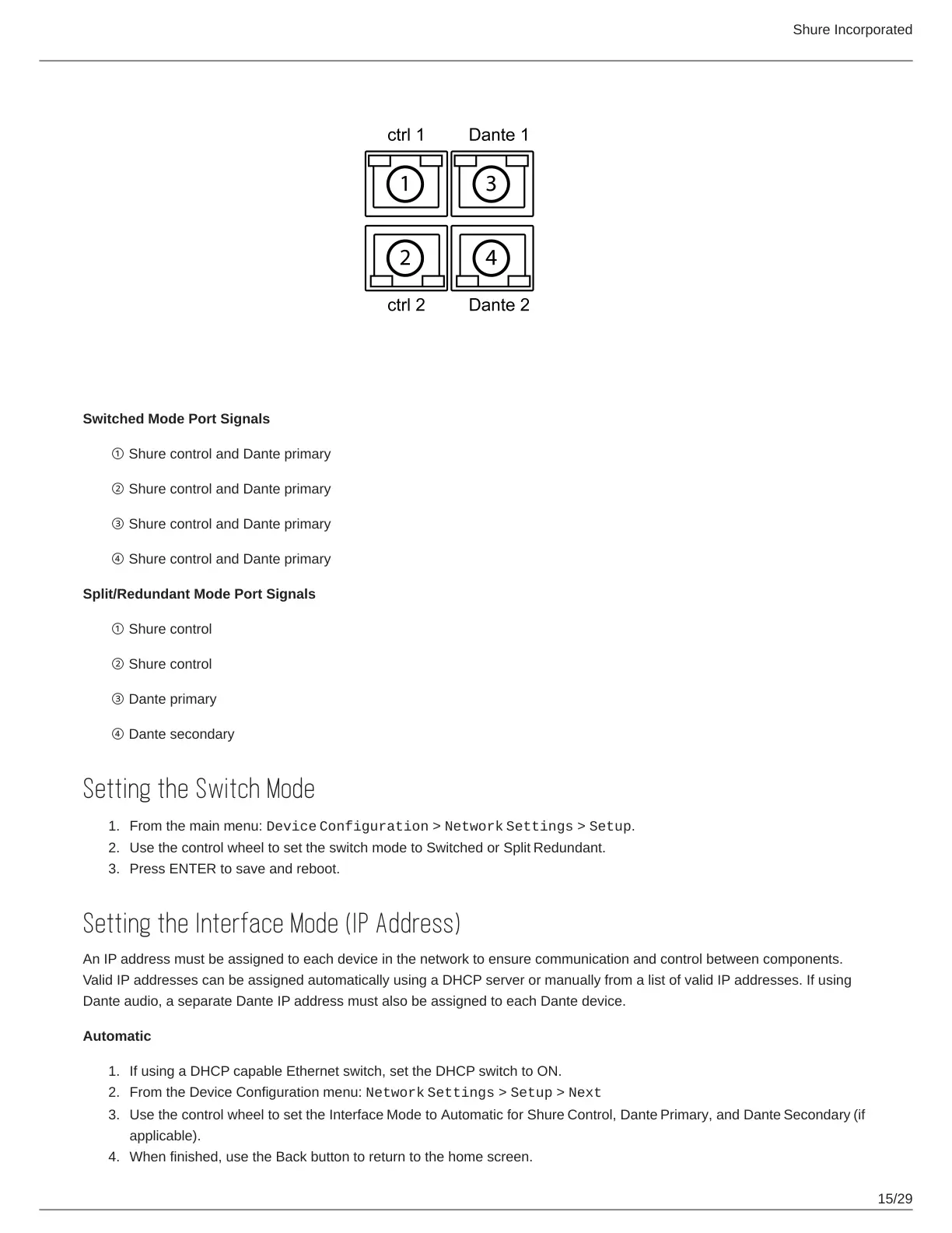 Use the control wheel to set the Interface Mode to Automatic for Shure Control, Dante Primary, and Dante Secondary (if