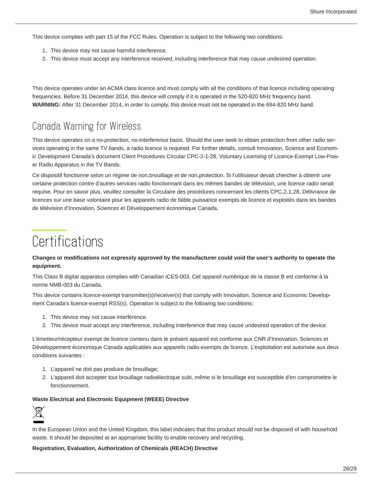 WARNING: After 31 December 2014, in order to comply, this device must not be operated in the 694-820 MHz band.
