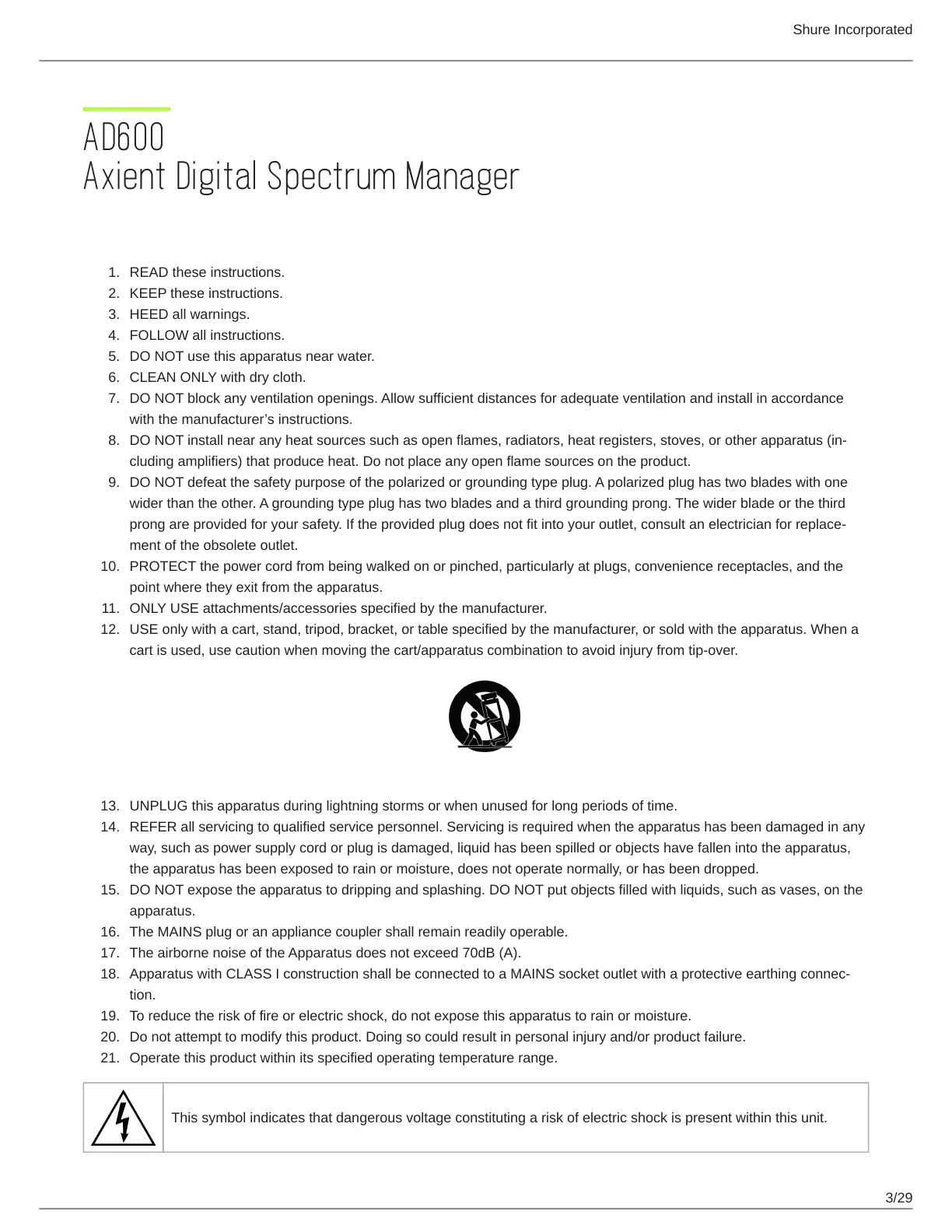 cart is used, use caution when moving the cart/apparatus combination to avoid injury from tip-over.